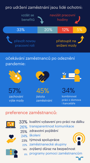 Praha, 24. února 2021 – Pandemie koronaviru neovlivňuje jen aktuální preference zaměstnanců, ale i jejich představy a očekávání do budoucna. Z výsledků posledního globálního průzkumu Workmonitor personálně poradenské společnosti Randstad vyplynulo, že pro zaměstnance bude po odeznění pandemie klíčové zachování výše mzdy (57 %), jistota zaměstnání (45 %) a kombinace práce z domova a z kanceláře (34 %).„Zatímco dnes jsou čeští zaměstnanci a uchazeči o práci spíš skromnější a do nového zaměstnání jsou ochotni nastoupit i za méně peněz než dříve, s koncem pandemie očekávají, že se jejich mzda dostane na původní úroveň. Jistota zaměstnání a stabilita a perspektiva zaměstnavatele zůstane i nadále prioritou zejména pro ženy. Ty také budou mít větší zájem nadále využívat práci z domova, a to zejména kvůli ochraně zdraví,“ komentuje Alžběta Honsová, marketingová manažerka české pobočky společnosti Randstad.Právě kvůli zájmu zaměstnanců z řad bílých límečků pracovat i po konci pandemie alespoň částečně z domova, považuje třetina respondentů průzkumu za důležité kvalitní kancelářské vybavení a technologie pro práci na dálku. K dalším zmiňovaným očekáváním pak patří transparentnost komunikace (26 %), zdravotní pojištění (25 %), školení (24 %), týmová spolupráce (23 %), zaměstnanecké skupiny jako je rodičovská nebo pečovatelská skupina pro zaměstnance během pandemie (22 %), zvýšený důraz na bezpečnost (14 %) a programy pomoci zaměstnancům (8 %), které nabízejí například psychologickou podporu.Čistě z kanceláře chce po odeznění pandemie pracovat jen necelých 10 % účastníků průzkumu. Naproti tomu plný home office si představuje 13 % respondentů. Valná většina chce mít možnost výběru – 34 % chce kombinovat práci z domova a z kanceláře, dalších 30 % také, ovšem zároveň uvítá mít možnost hýbat si pružně s časem pracovní doby. 2 % zaměstnanců pak chtějí pracovat odkudkoliv ze světa jako digitální nomádi. „Je patrné, že během uplynulého roku se pracovníci s prací z domova poměrně sžili. Kancelář postrádají jen z důvodu sociálních interakcí anebo v případě rodičů menších dětí kvůli možnosti se koncentrovat,“ říká Alžběta Honsová a dodává: „Hybridní pracovní prostředí proto bude do budoucna řešením pro většinu kancelářských oborů.“